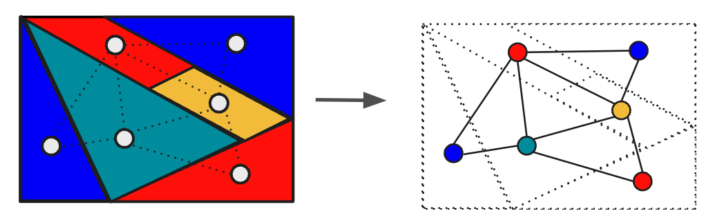 以下では、隣接する頂点が同じ色にならないように全ての頂点に色を割り当てる頂点彩色問題を考えます。この頂点彩色問題は、下記の図のように解釈することで四色定理を適用することができ、最大でも4つの色で塗り分けれることがわかります。