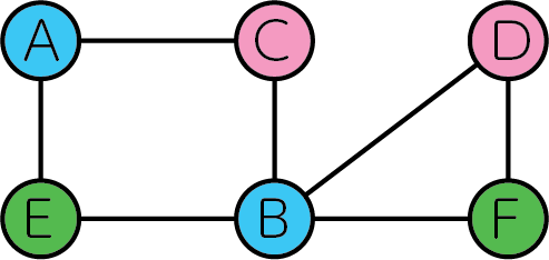 このグラフは3-coloringです。なぜなら、以下のように3つの色で頂点を塗り分けることで、辺で隣接する頂点同士が異なる色にできるからです。