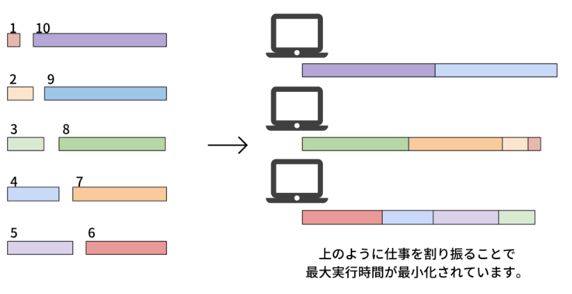 タスク1は1時間の実行時間、タスク2は3時間の実行時間、のように、整数長のタスクがいくつかあるような場合を考えましょう。 「これらのタスクを複数コンピュータに分散させる場合、偏りを生じさせることなく、これらのコンピュータの実行時間を最適に分散させるにはどうすれば良いか?」を求める問題です。
