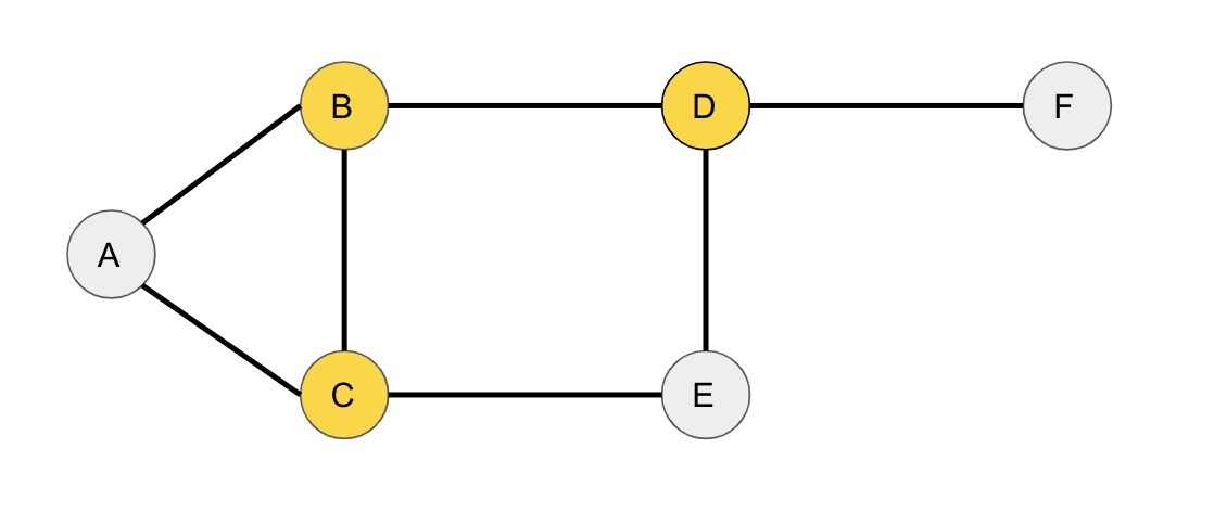 このグラフの頂点をA, B, C, D, E, Fとし、頂点どうしを結ぶ線分は辺として表現されています。 このグラフにおける頂点被覆は、\(\{B, C, D\}\)となります。 各辺は少なくとも1つ、これらの頂点を含んでいます。
