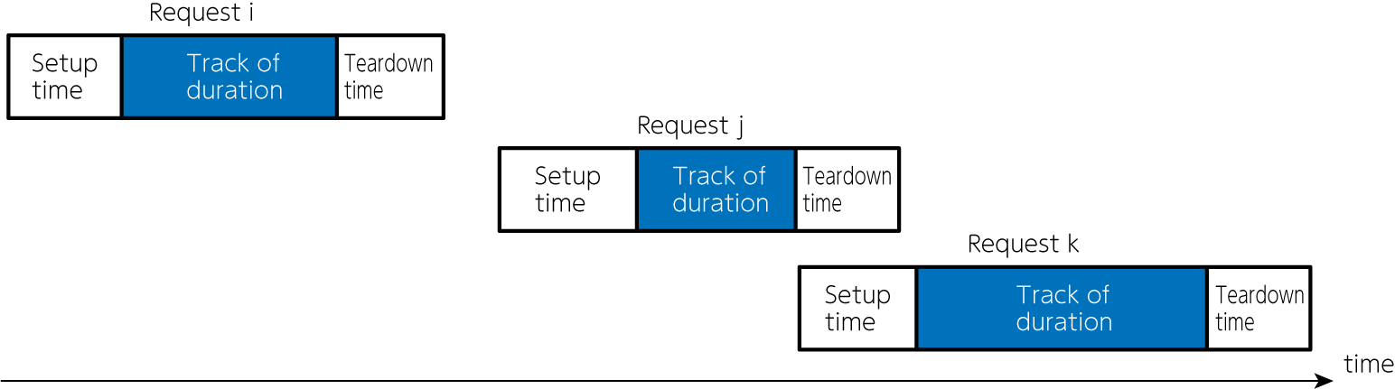 \(N\) 個のリクエストがあり、これを \(\mathcal{Q} = \{Q_1, Q_2, \dots, Q_N\}\) とします。あるリクエスト \(Q_n\) が \(M\) 個の(アンテナや装置などの地上の)リソースに割り当てることを考えます。このリソースの集合を \(\mathcal{S} = \{S_1, S_2, \dots, S_M\}\) とするとき、各地上のリソース \(S_m\) に対し、宇宙にある衛星が見える期間を \(\mathcal{V} = \{V_1, V_2, \dots, V_K\}\) とします。衛星が見える期間の開始時刻(rise time)と終了時刻(set time)をそれぞれrt, stと定義します。また、実際に衛星に信号を送信が開始できるようになるのはrtからわずかに遅れた時刻であり、送信ができるのはstからわずかに早い時刻までであるため、実際に送信が開始できる時刻と送信が終了する時刻をtn, tfと定義することとします。加えて、各リクエストに対して、要求された装置を準備する時間、装置を撤去するための時間が必要なので、それらをsu, tdと定義します。さらに、各リクエストにはトラッキングの継続時間drが定められていることとします。